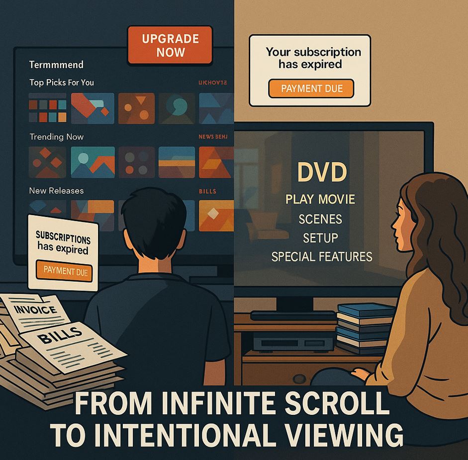 Many young people also report digital burnout: the constant push of notifications, autoplay trailers, and endless scrolls. Turning on a DVD or flipping to a TV channel creates a “boundary” that algorithmic streaming doesn’t.
